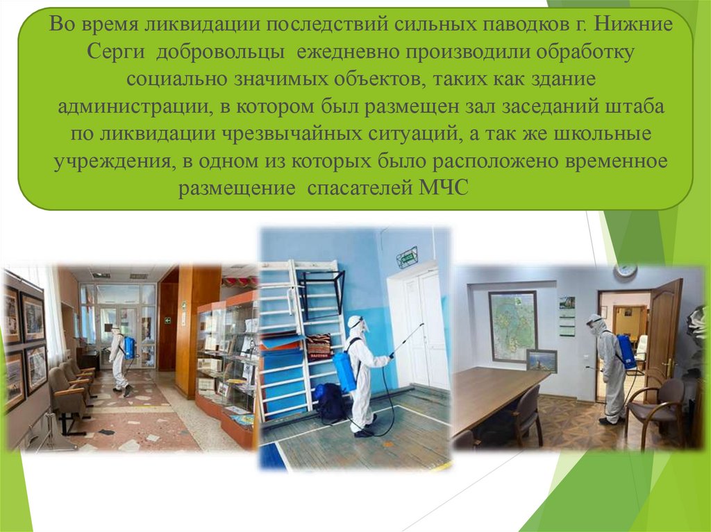 Во время ликвидации последствий сильных паводков г. НижниеСерги добровольцы ежедневно производили обработку
