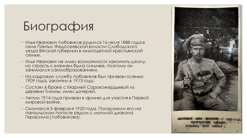 Биография◦ Илья Иванович Лобовиков родился 16 июля 1888 года в