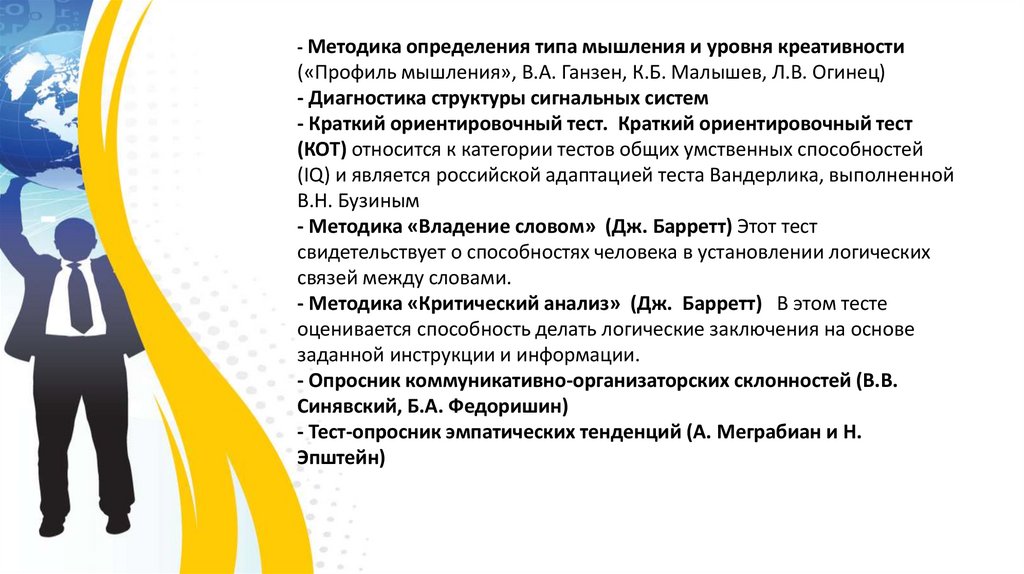 - Методика определения типа мышления и уровня креативности(«Профиль мышления», В.А. Ганзен, К.Б. Малышев, Л.В. Огинец)