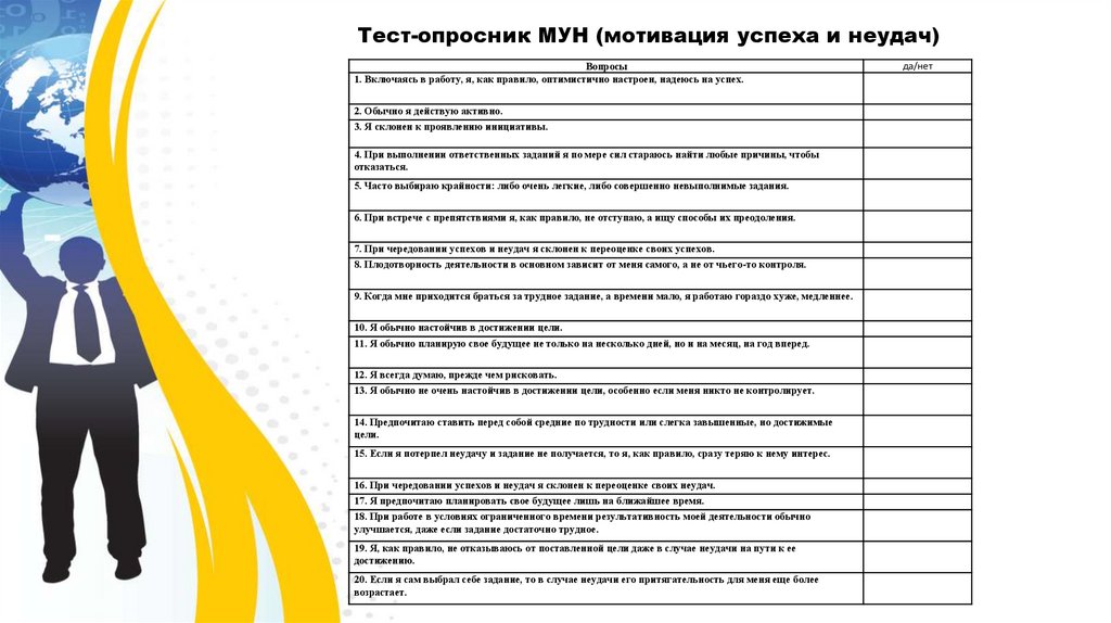 Тест-опросник МУН (мотивация успеха и неудач)Вопросы