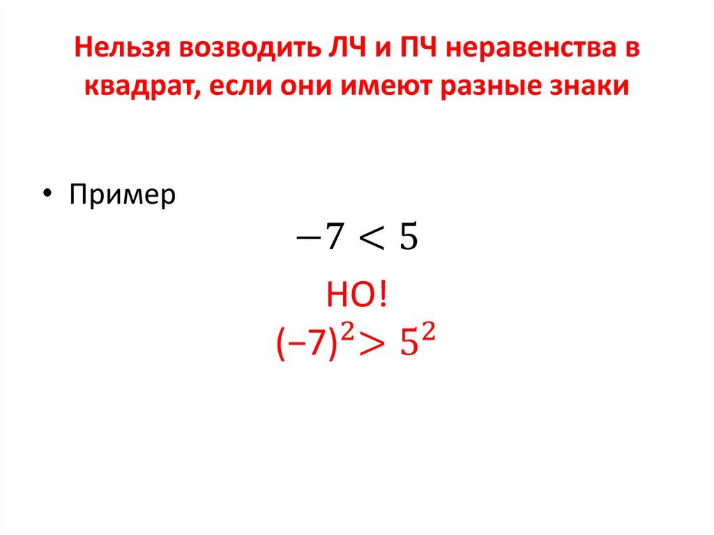 Нельзя возводить ЛЧ и ПЧ неравенства вквадрат, если они имеют разные знаки