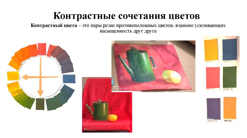 Контрастные сочетания цветовКонтрастный цвета – это пары резко противоположных цветов, взаимно усиливающих