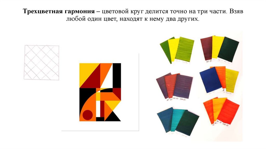Трехцветная гармония – цветовой круг делится точно на три части. Взявлюбой один цвет, находят к нему два других.