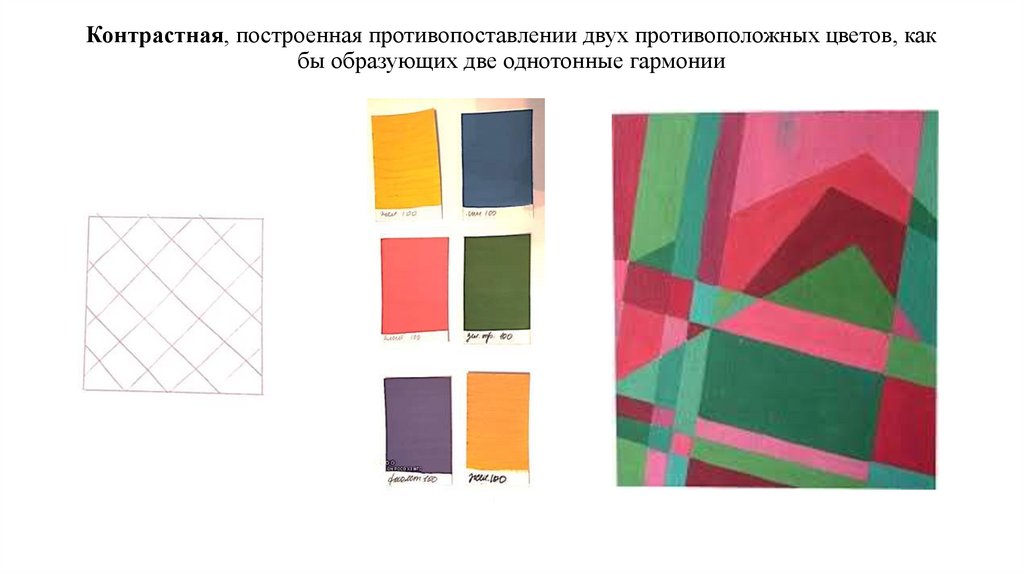 Контрастная, построенная противопоставлении двух противоположных цветов, какбы образующих две однотонные гармонии