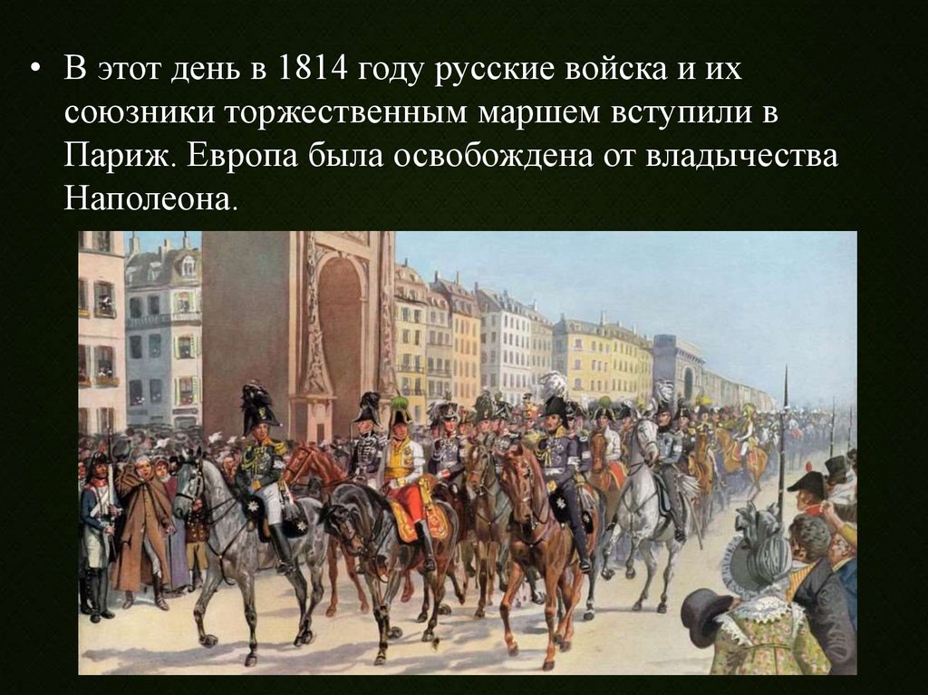 • В этот день в 1814 году русские войска и ихсоюзники торжественным маршем вступили в