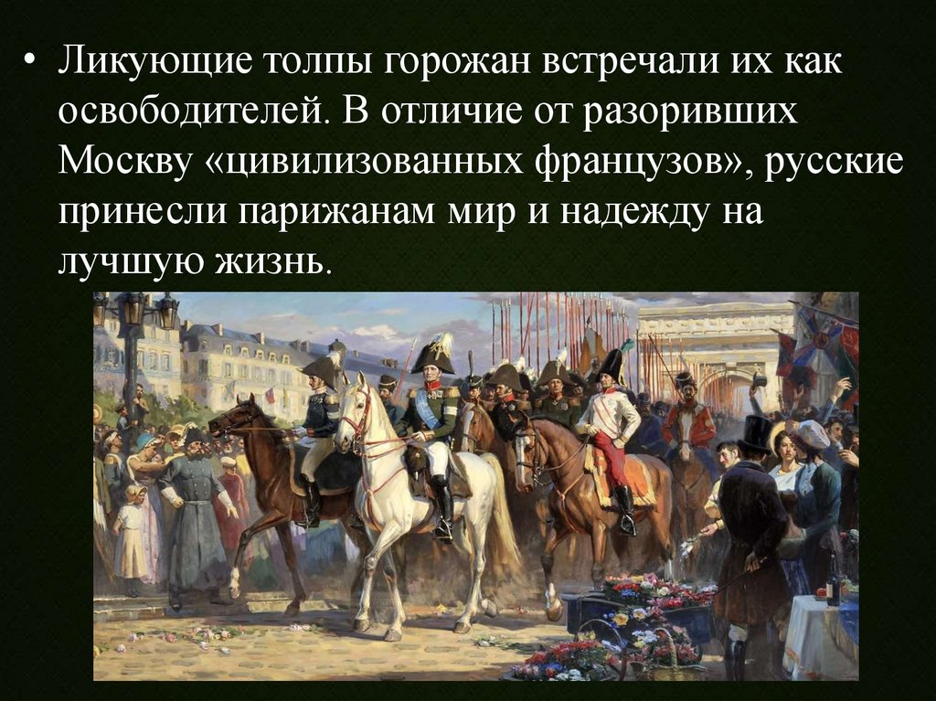 • Ликующие толпы горожан встречали их какосвободителей. В отличие от разоривших