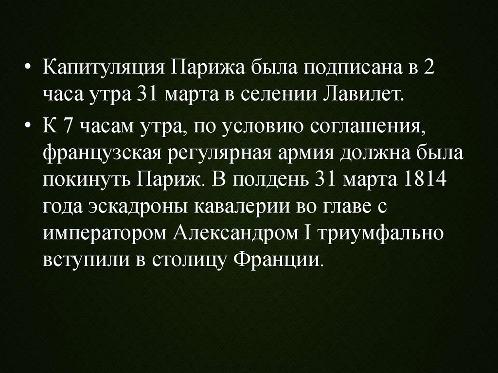 • Капитуляция Парижа была подписана в 2часа утра 31 марта в селении Лавилет.
