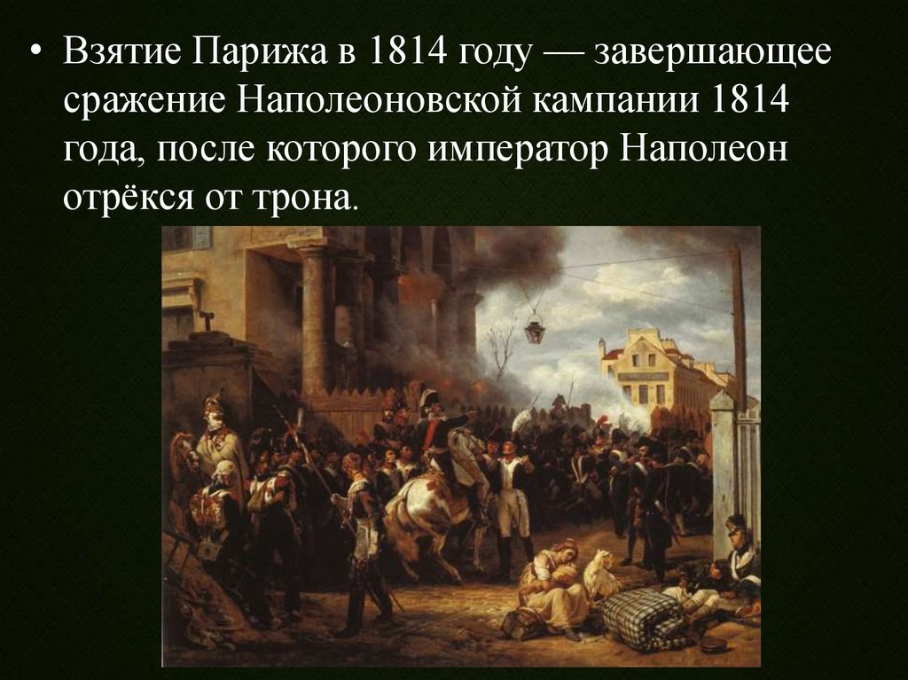 • Взятие Парижа в 1814 году — завершающеесражение Наполеоновской кампании 1814