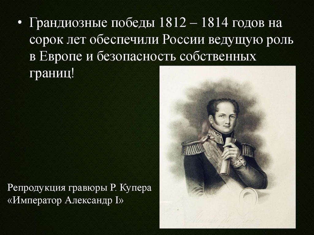 • Грандиозные победы 1812 – 1814 годов насорок лет обеспечили России ведущую роль