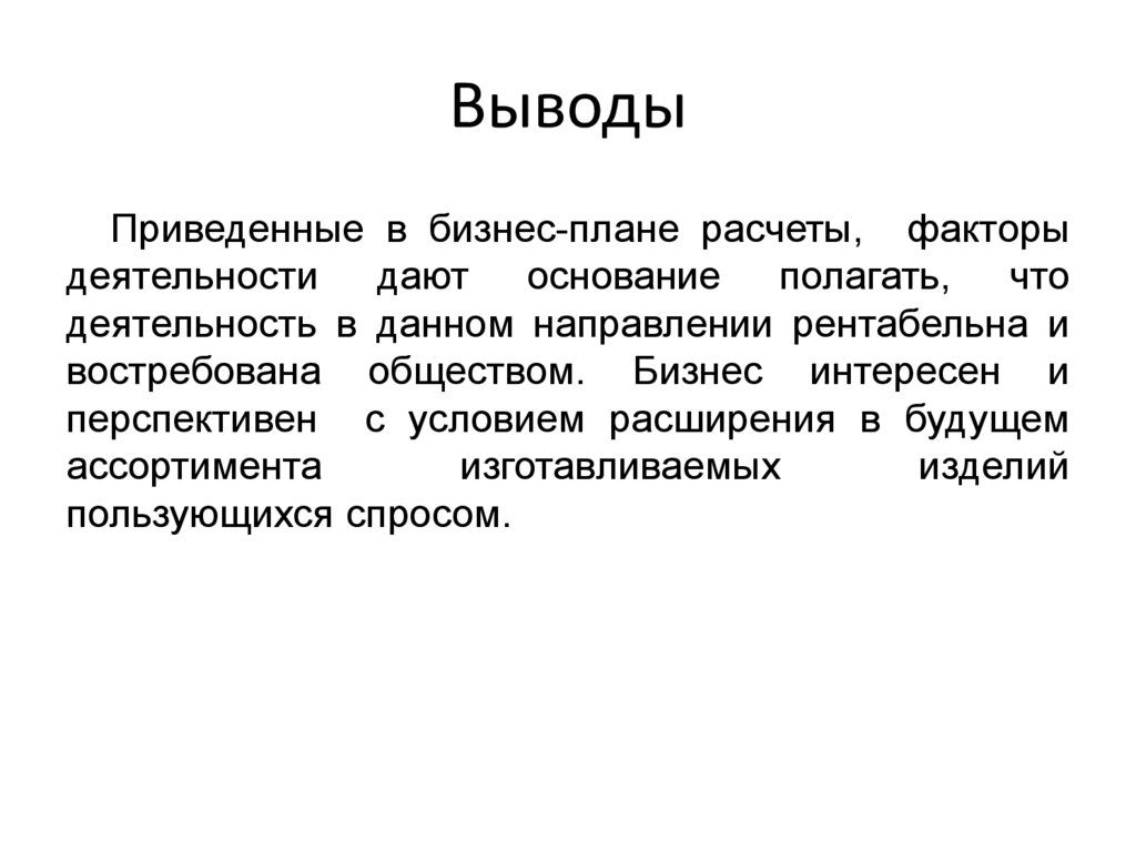 ВыводыПриведенные в бизнес-плане расчеты, факторы