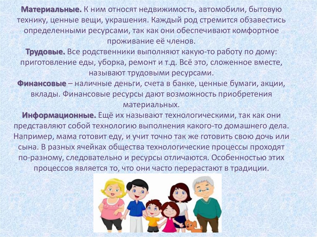 Материальные. К ним относят недвижимость, автомобили, бытовуютехнику, ценные вещи, украшения. Каждый род стремится обзавестись