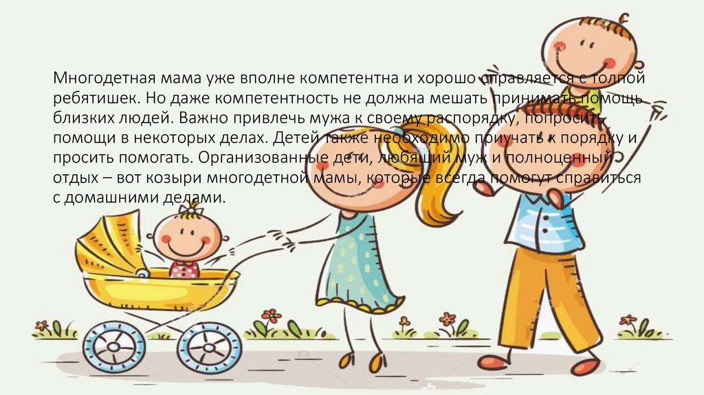 Многодетная мама уже вполне компетентна и хорошо справляется с толпойребятишек. Но даже компетентность не должна мешать принимать помощь