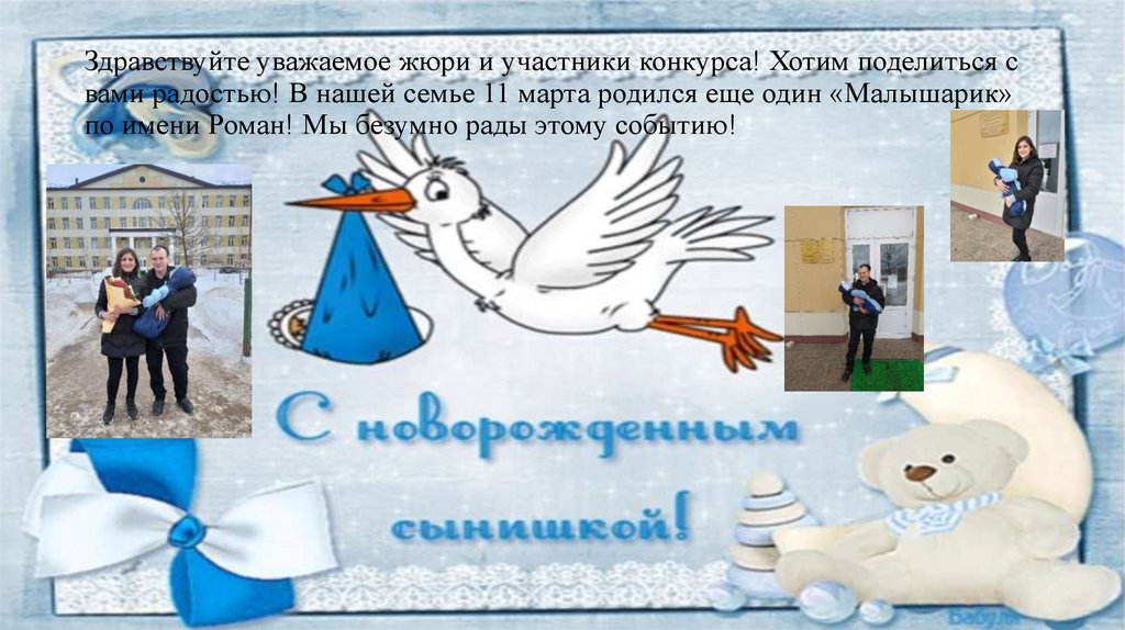 Здравствуйте уважаемое жюри и участники конкурса! Хотим поделиться свами радостью! В нашей семье 11 марта родился еще один «Малышарик»