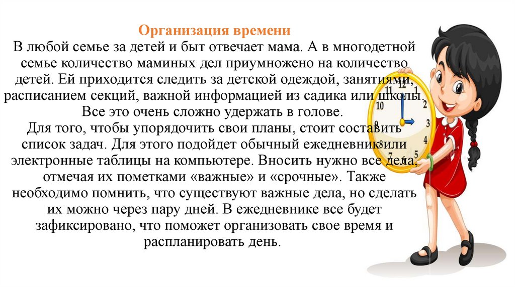 Организация времениВ любой семье за детей и быт отвечает мама. А в многодетной