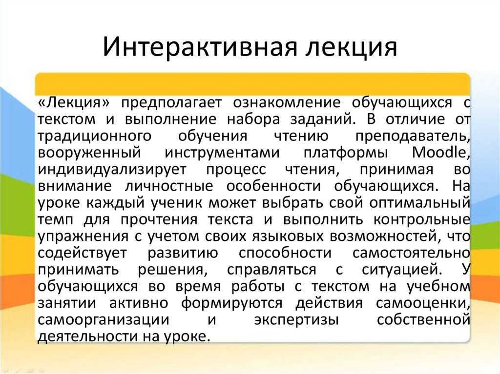 Интерактивная лекция«Лекция» предполагает ознакомление обучающихся с