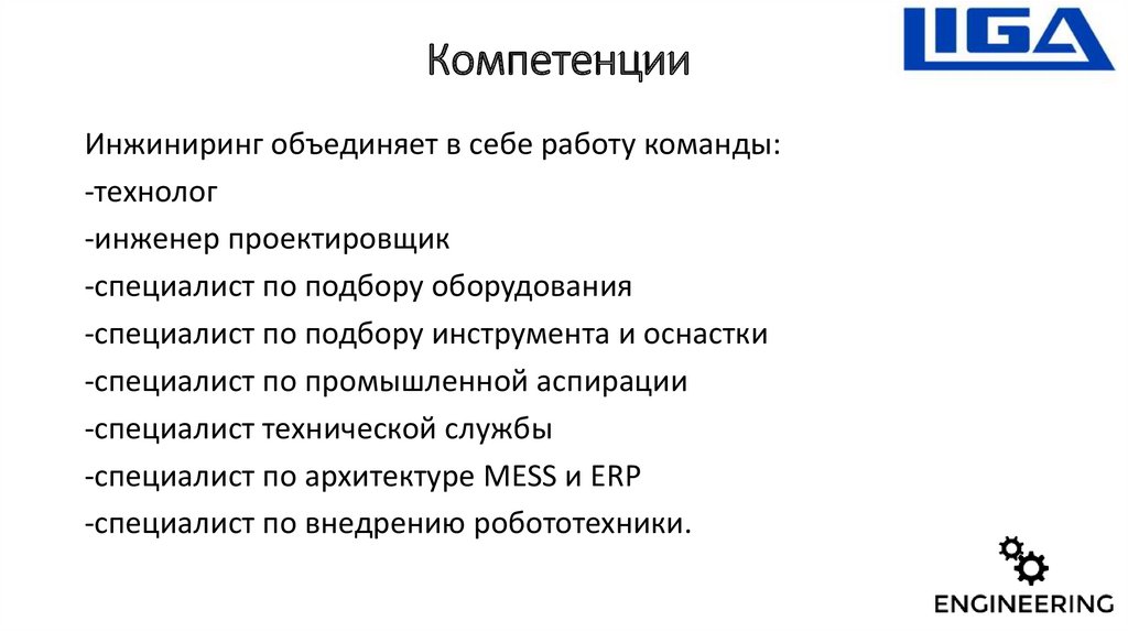 КомпетенцииИнжиниринг объединяет в себе работу команды: