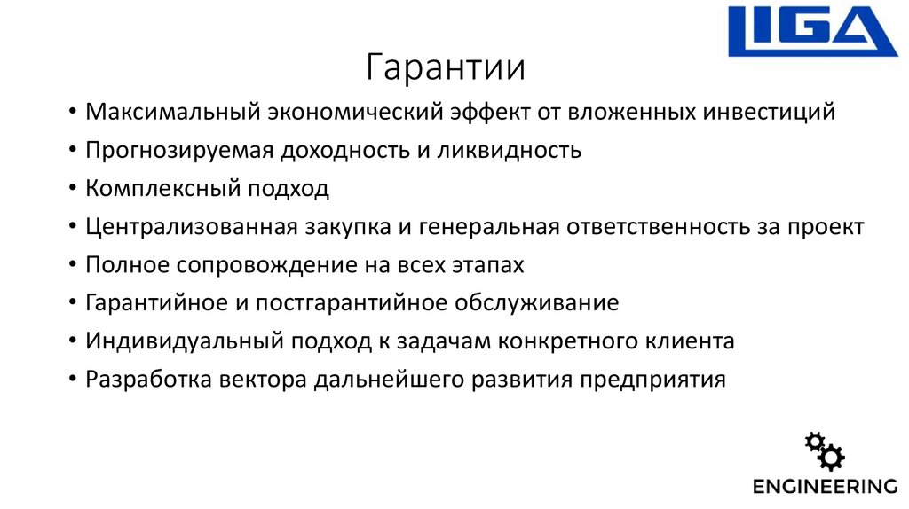 Гарантии• Максимальный экономический эффект от вложенных инвестиций