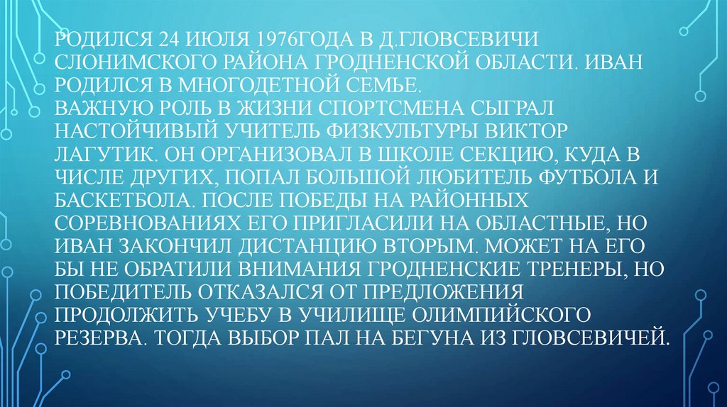 РОДИЛСЯ 24 ИЮЛЯ 1976ГОДА В Д.ГЛОВСЕВИЧИСЛОНИМСКОГО РАЙОНА ГРОДНЕНСКОЙ ОБЛАСТИ. ИВАН