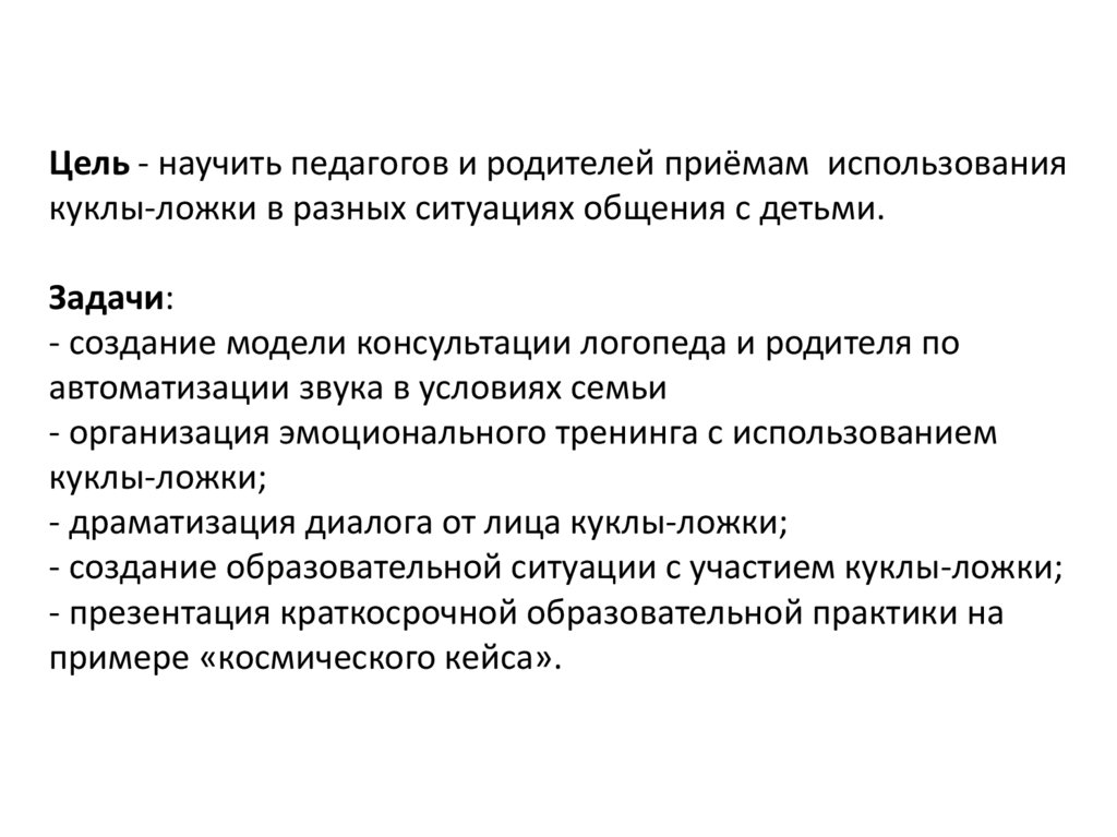 Цель - научить педагогов и родителей приёмам использованиякуклы-ложки в разных ситуациях общения с детьми.