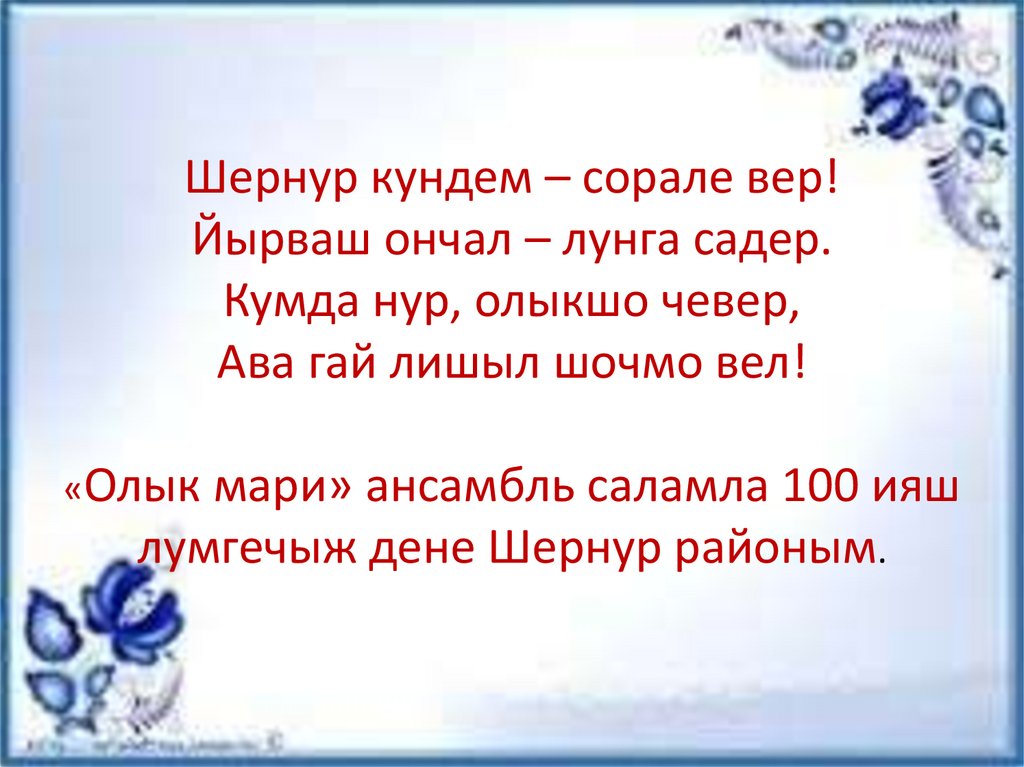 «Олык мари» ансамбль саламла 100 ияш лумгечыж дене Шернур районым