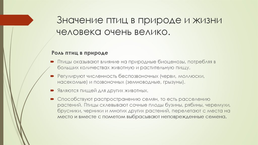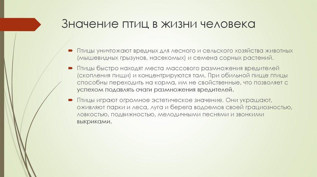 Значение птиц в жизни человекаПтицы уничтожают вредных для лесного и сельского хозяйства животных