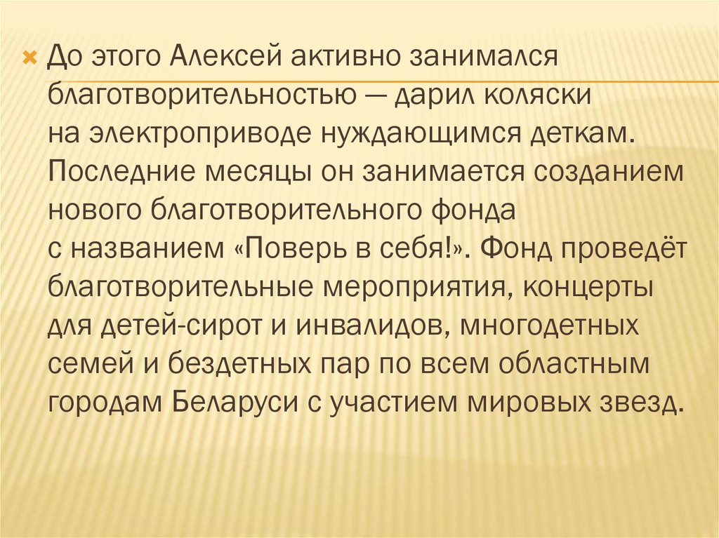 До этого Алексей активно занималсяблаготворительностью — дарил коляски