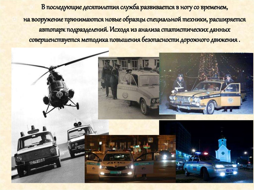 В последующие десятилетия служба развивается в ногу со временем,на вооружение принимаются новые образцы специальной техники, расширяется