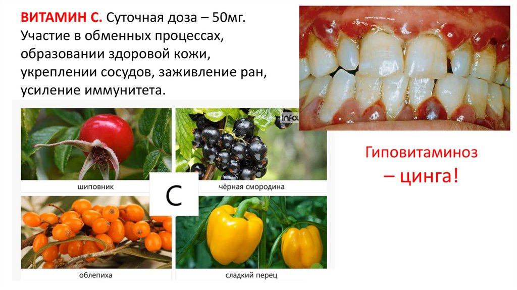 ВИТАМИН С. Суточная доза – 50мг.Участие в обменных процессах,