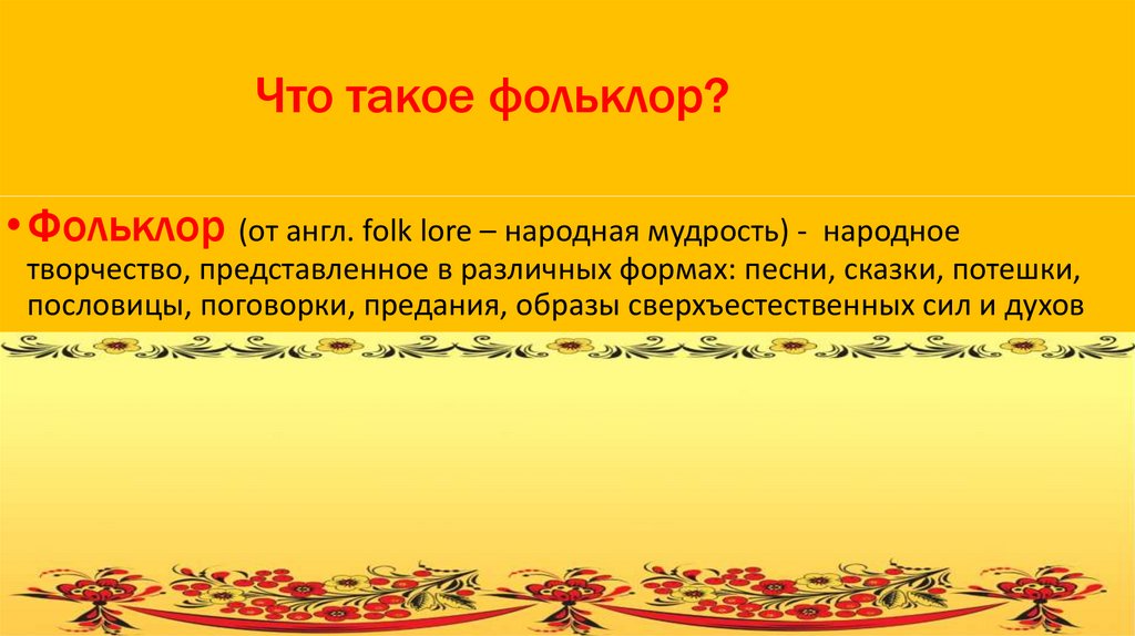 Что такое фольклор?• Фольклор (от англ. folk lore – народная мудрость) -