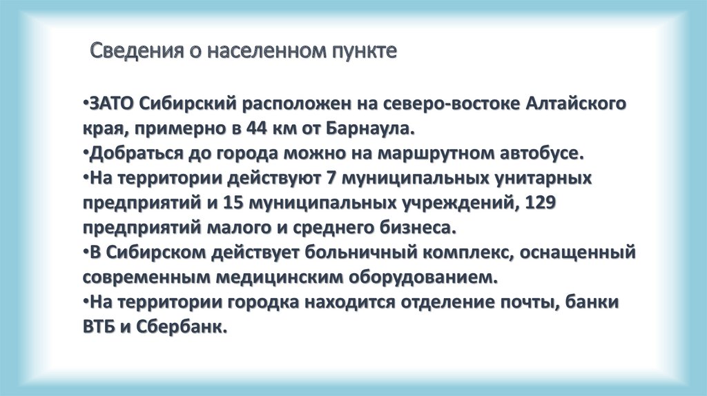 Сведения о населенном пункте•ЗАТО Сибирский расположен на северо-востоке Алтайского