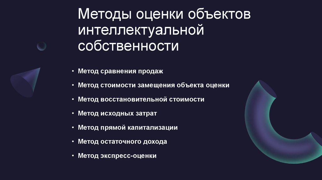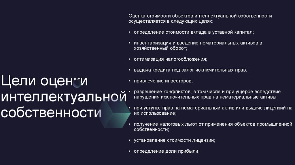 Оценка стоимости объектов интеллектуальной собственностиосуществляется в следующих целях: