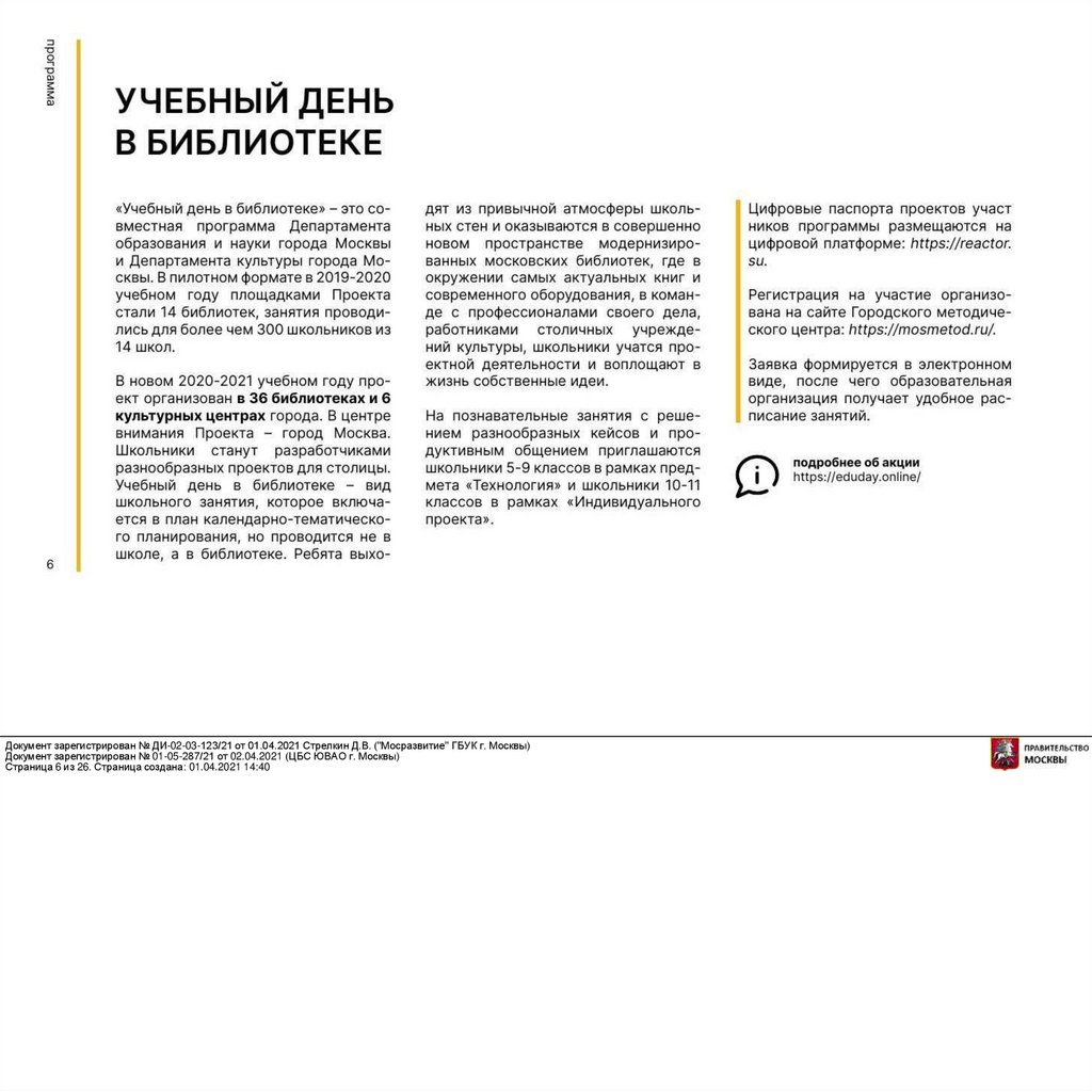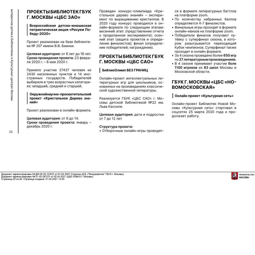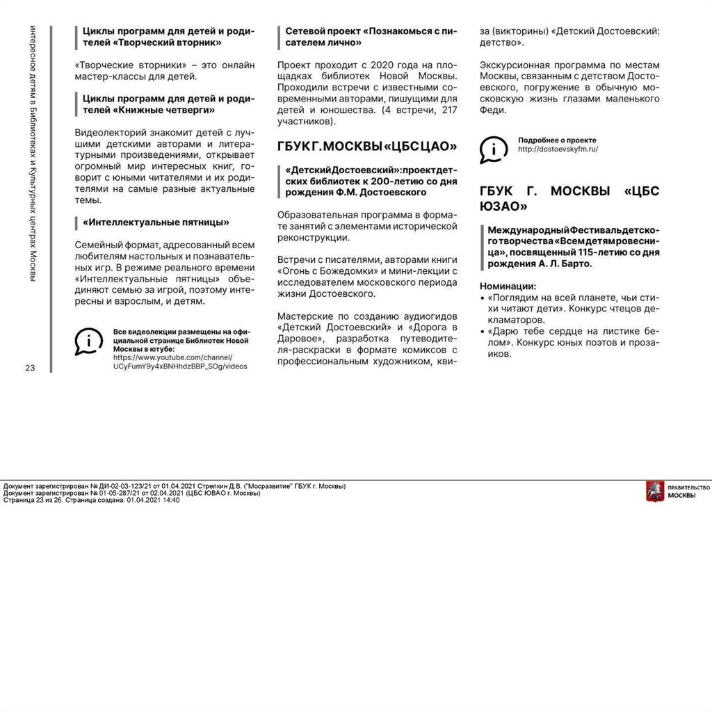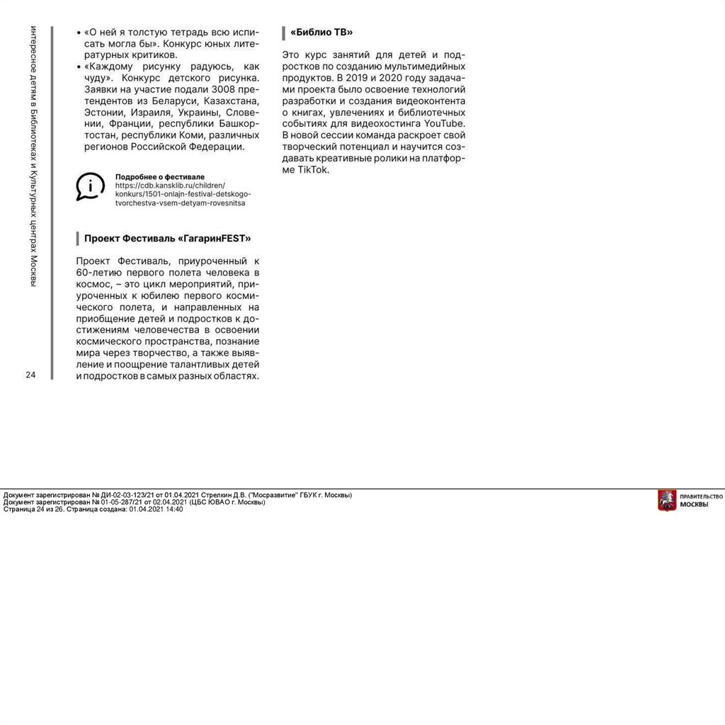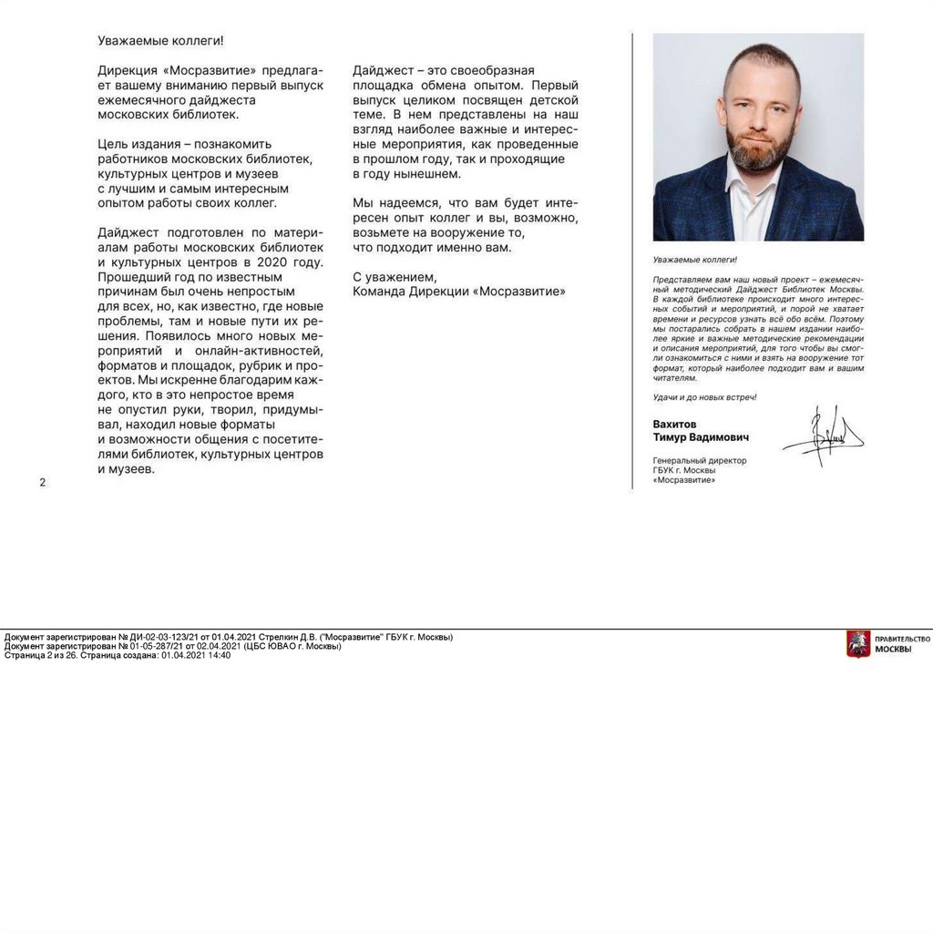 Документ зарегистрирован № ДИ-02-03-123/21 от 01.04.2021 Стрелкин Д.В. ("Мосразвитие" ГБУК г. Москвы)Документ зарегистрирован № 01-05-287/21 от 02.04.2021 (ЦБС ЮВАО г. Москвы)