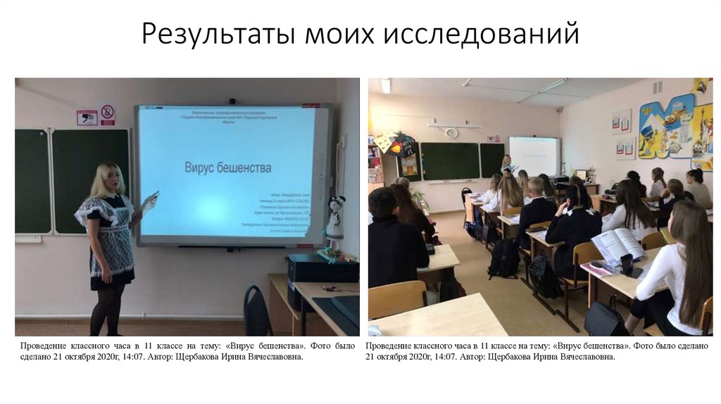 Результаты моих исследованийПроведение классного часа в 11 классе на тему: «Вирус бешенства». Фото было