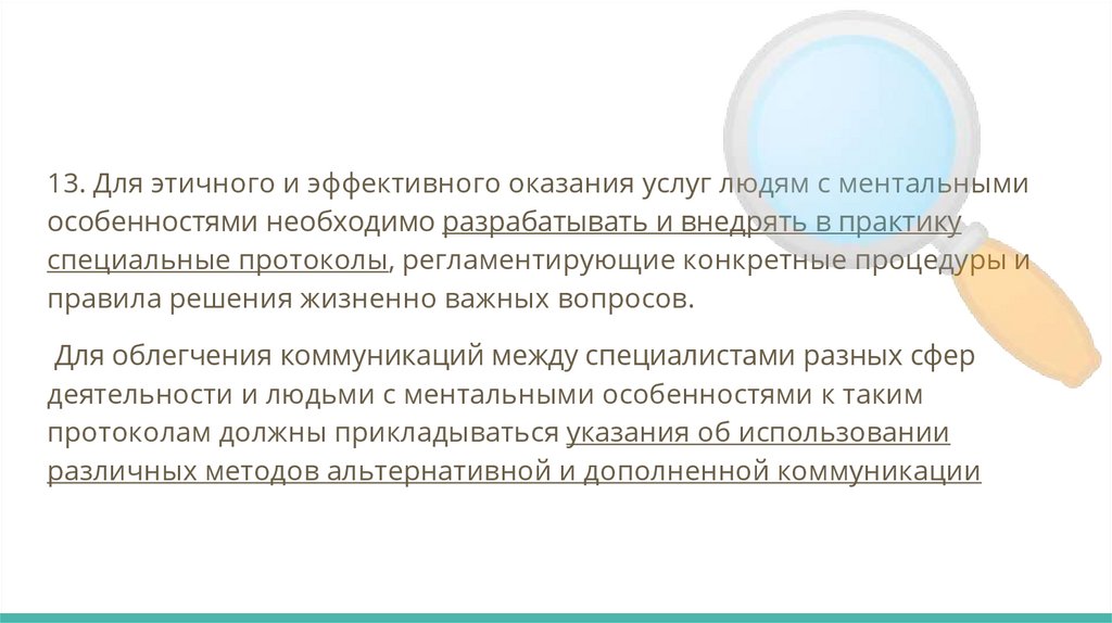 13. Для этичного и эффективного оказания услуг людям с ментальнымиособенностями необходимо разрабатывать и внедрять в практику