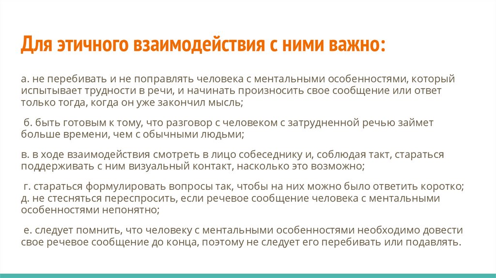 Для этичного взаимодействия с ними важно:а. не перебивать и не поправлять человека с ментальными особенностями, который