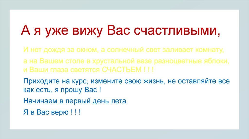 А я уже вижу Вас счастливыми,Приходите на курс, измените свою жизнь, не оставляйте все