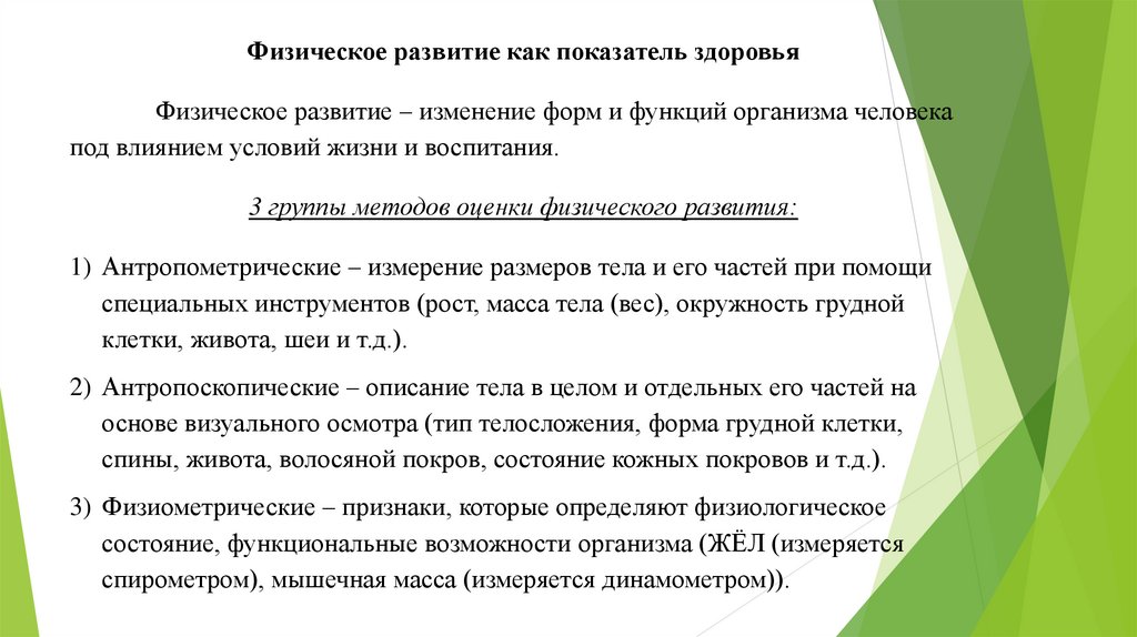 Физическое развитие как показатель здоровьяФизическое развитие – изменение форм и функций организма человека