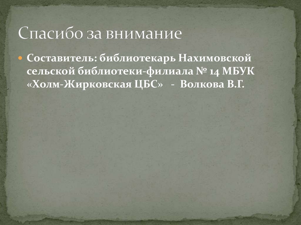 Составитель: библиотекарь Нахимовскойсельской библиотеки-филиала № 14 МБУК