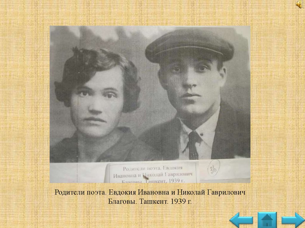 Родители поэта. Евдокия Ивановна и Николай ГавриловичБлаговы. Ташкент. 1939 г.