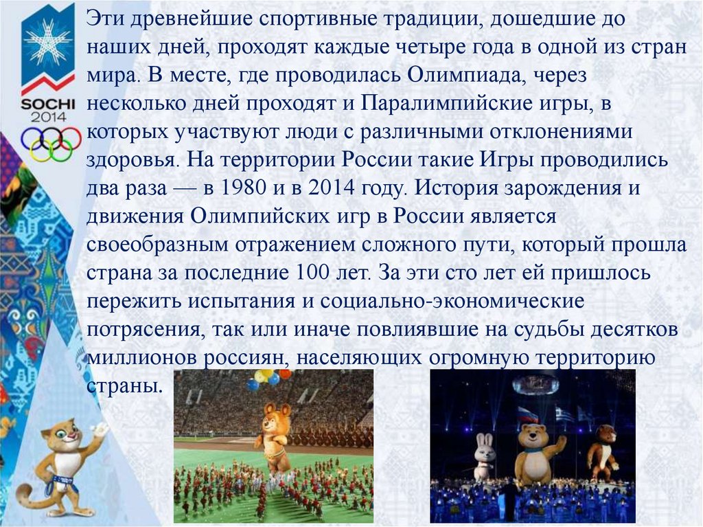Эти древнейшие спортивные традиции, дошедшие донаших дней, проходят каждые четыре года в одной из стран