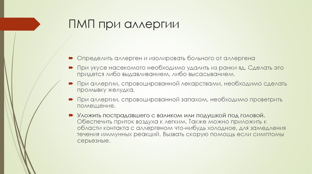 ПМП при аллергииОпределить аллерген и изолировать больного от аллергена