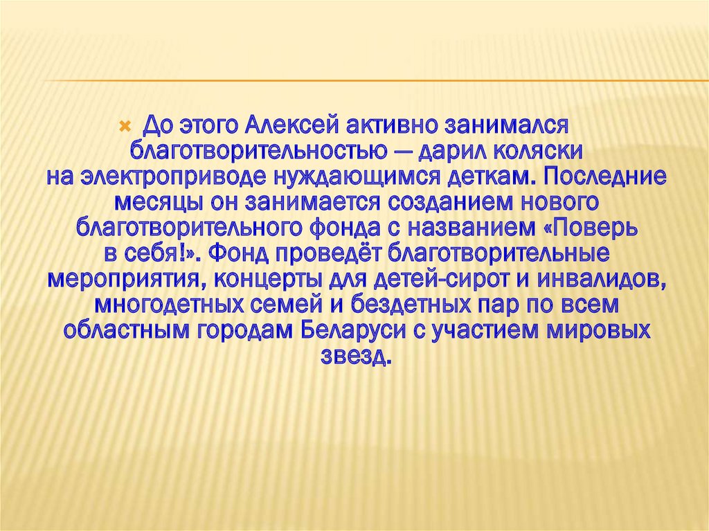 До этого Алексей активно занималсяблаготворительностью — дарил коляски