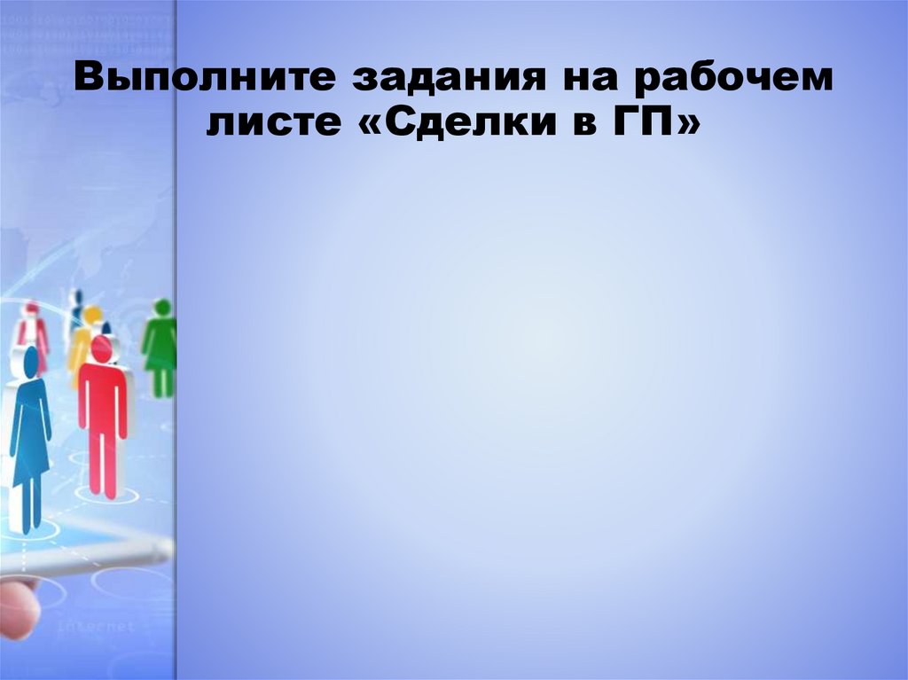 Выполните задания на рабочемлисте «Сделки в ГП»