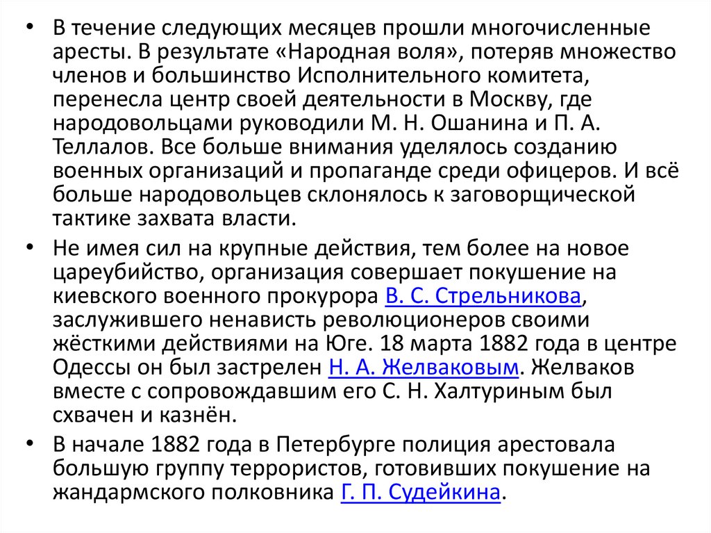 • В течение следующих месяцев прошли многочисленныеаресты. В результате «Народная воля», потеряв множество