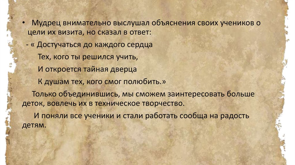 • Мудрец внимательно выслушал объяснения своих учеников оцели их визита, но сказал в ответ: