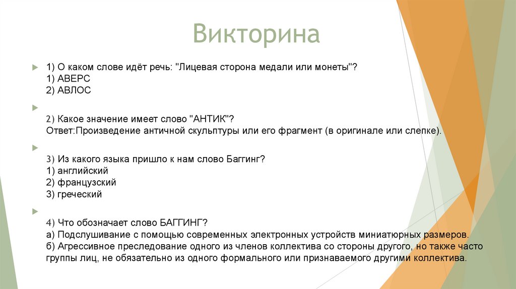 Викторина1) О каком слове идёт речь: "Лицевая сторона медали или монеты"?