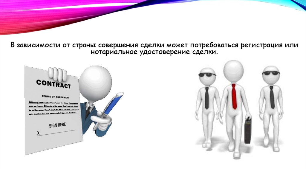 В зависимости от страны совершения сделки может потребоваться регистрация илинотариальное удостоверение сделки.