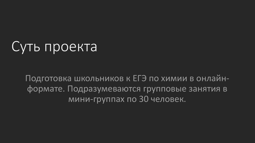 Суть проектаПодготовка школьников к ЕГЭ по химии в онлайнформате. Подразумеваются групповые занятия в
