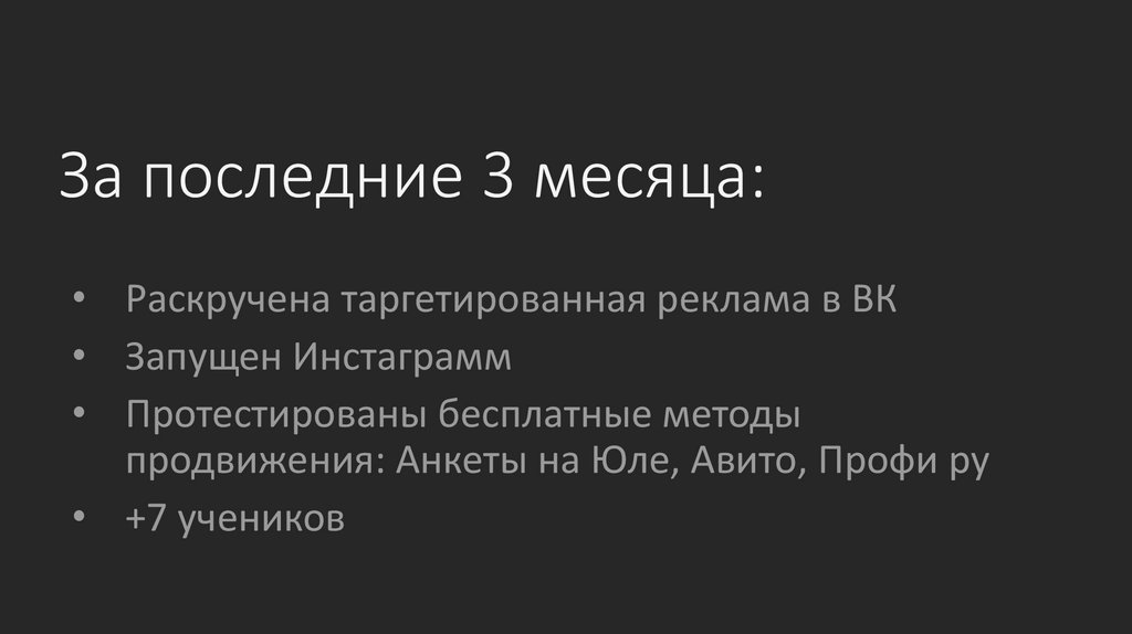 За последние 3 месяца:• Раскручена таргетированная реклама в ВК