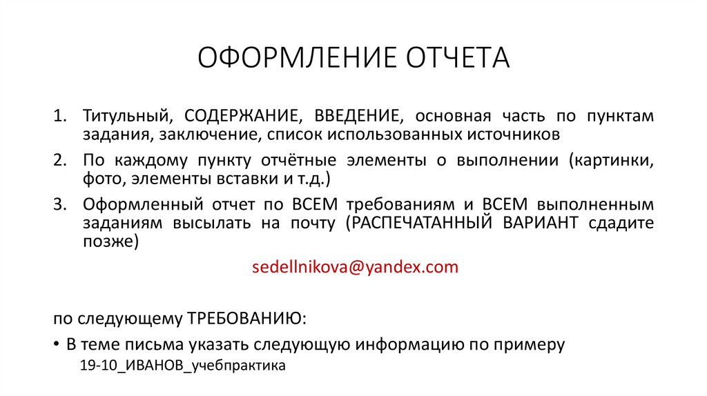 ОФОРМЛЕНИЕ ОТЧЕТА1. Титульный, СОДЕРЖАНИЕ, ВВЕДЕНИЕ, основная часть по пунктам